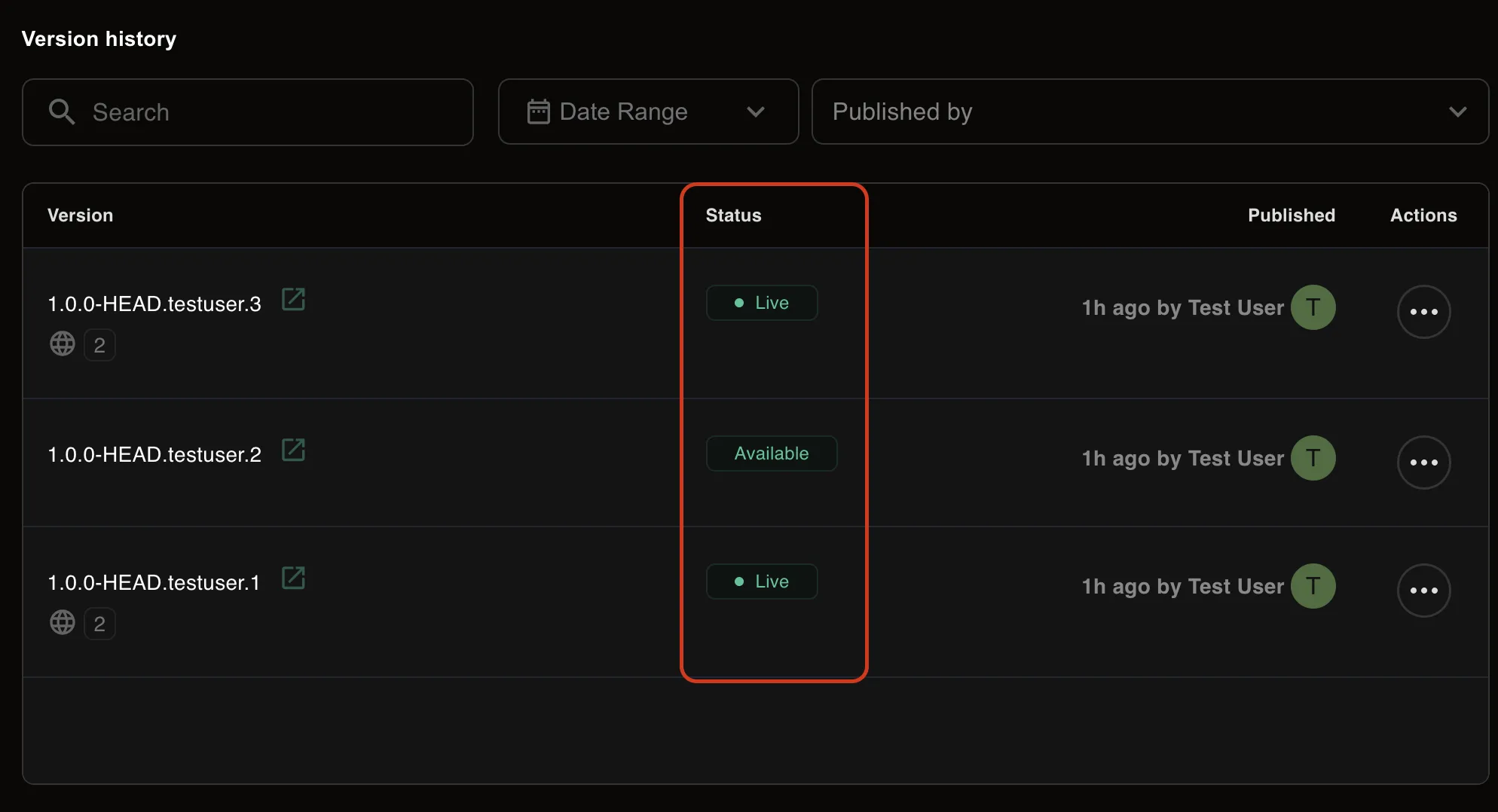 The Version Status feature allows you to track and manage different versions of your application. You can mark a version as Available, Deprecated, Unavailable, Failed, Rolled back, Live.